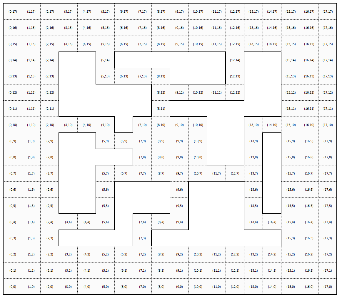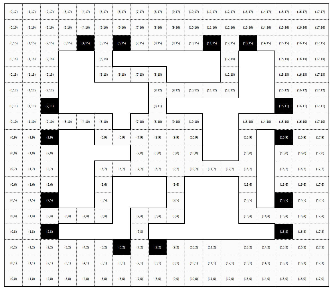 | Top row (y=15) | (4,15), (6,15), (11,15), (13,15) | 4 |