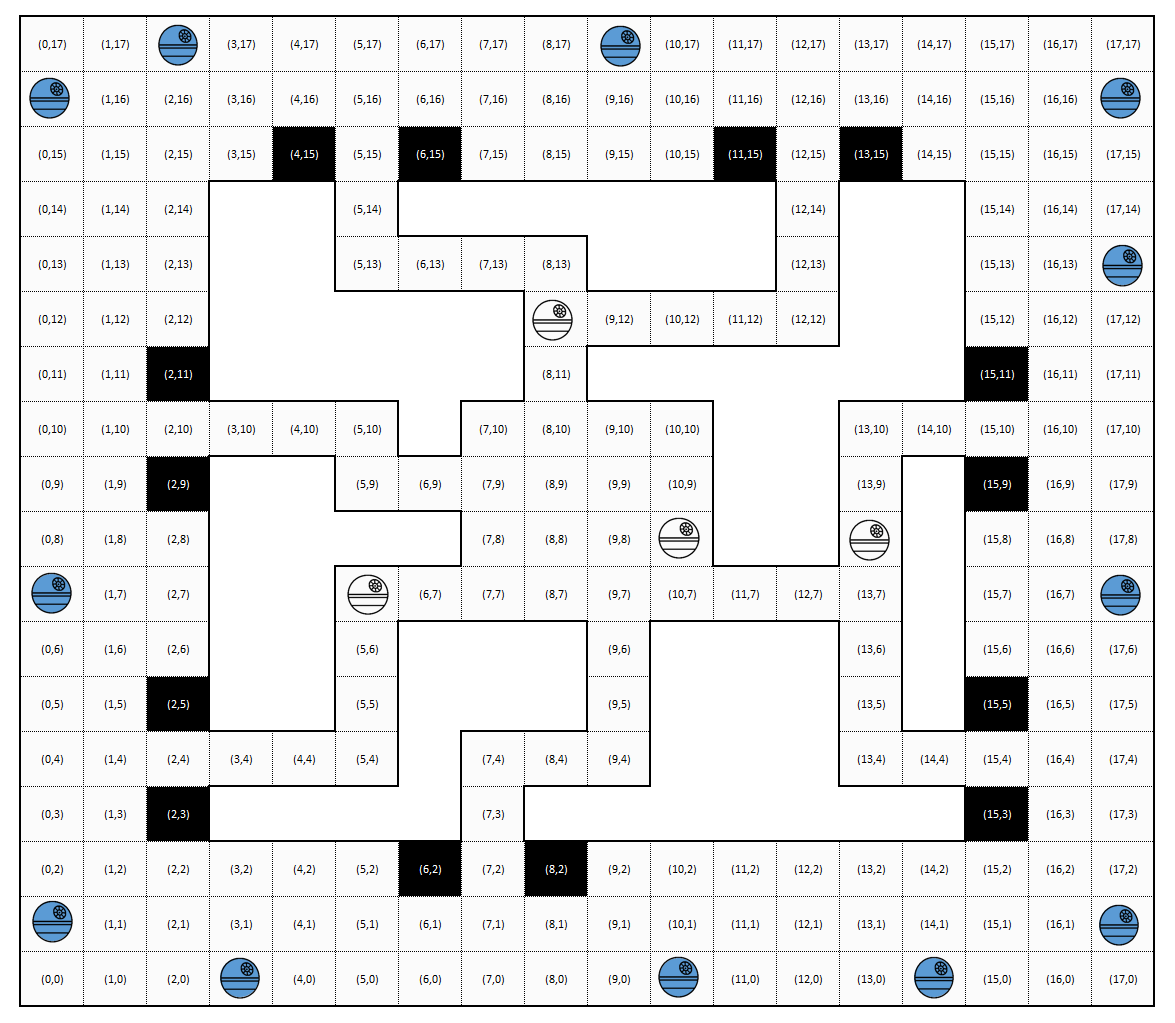 The map contains 86 void tiles (impassable areas with no planets) that form the maze corridors players must navigate through.