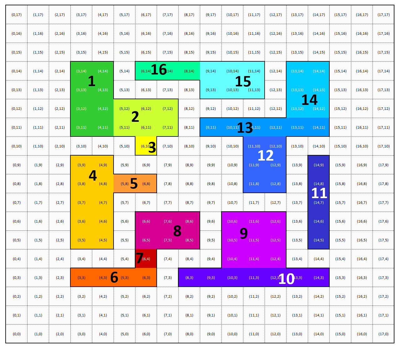 The following image shows the 16 void zones numbered and color-coded. These void zones will be used to define the map structure.