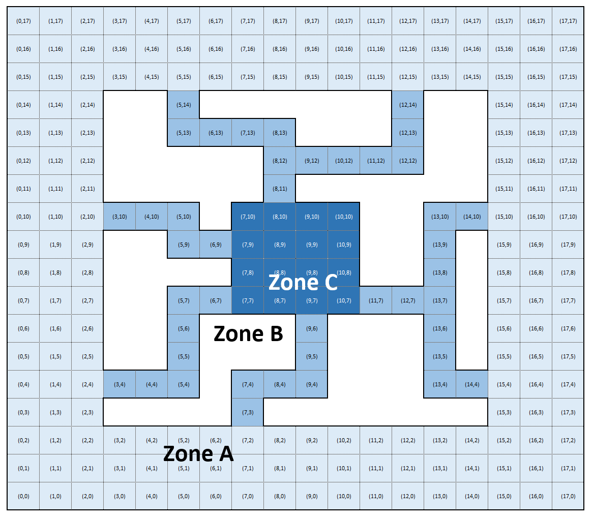 All voids lie within Zone B (Rings 3–6), leaving the outer border (Zone A) and the inner core (Zone C) completely open. The voids can be defined as either individual tile zones or larger rectangle zones. The following table lists all 16 void zones and their locations.