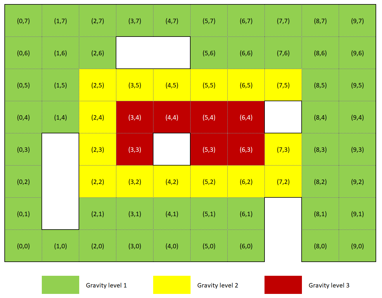 Gravity increases from the outer edge toward the center (green / yellow / red), creating a gradient of movement costs across the map.