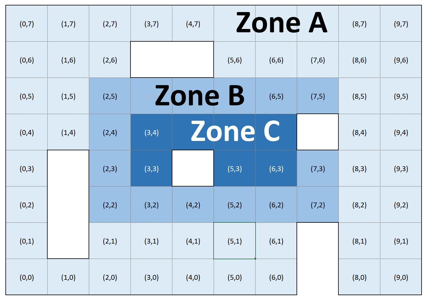 Moving through the center (Zone C) costs three times as much energy as traveling along the outer edge (Zone A). This encourages players to weigh the trade-off between taking a shorter but more expensive path through the center versus a longer but cheaper route along the border.